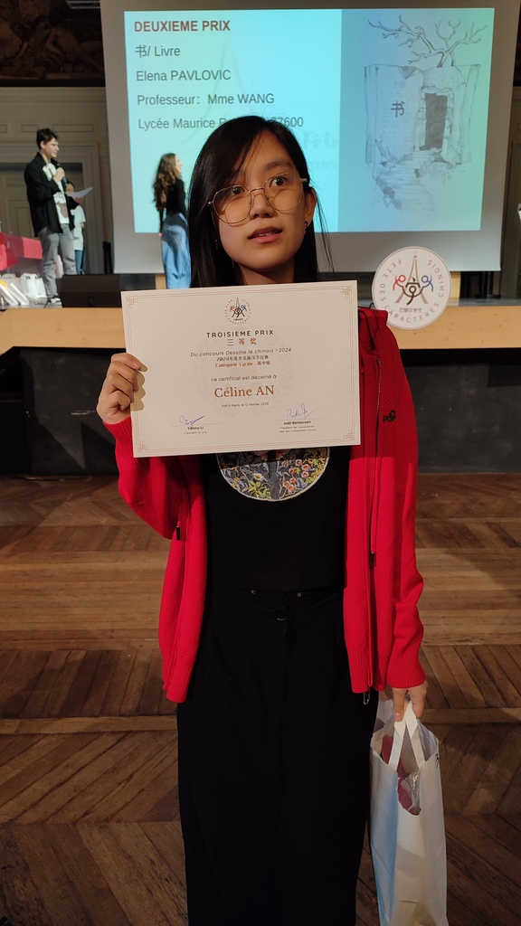 Le mercredi 12 février c'était la fête des lanternes clôturant deux semaines de la période festive du nouvel an chinois. Dans la salle des fêtes de la mairie du 13e arrondissement, les lauréats du concours "Dessine le chinois" reçoivent leurs prix dans une ambiance chaleureuse et festive. Mlle. Céline AN, élève de 1ère1 de notre lycée a obtenu le 3e prix. Son œuvre dédié au nouvel an est exposé parmi les 30 autres, sélectionnés par l'AFCC (association de la fête des caractères chinois), organisateur du concours.